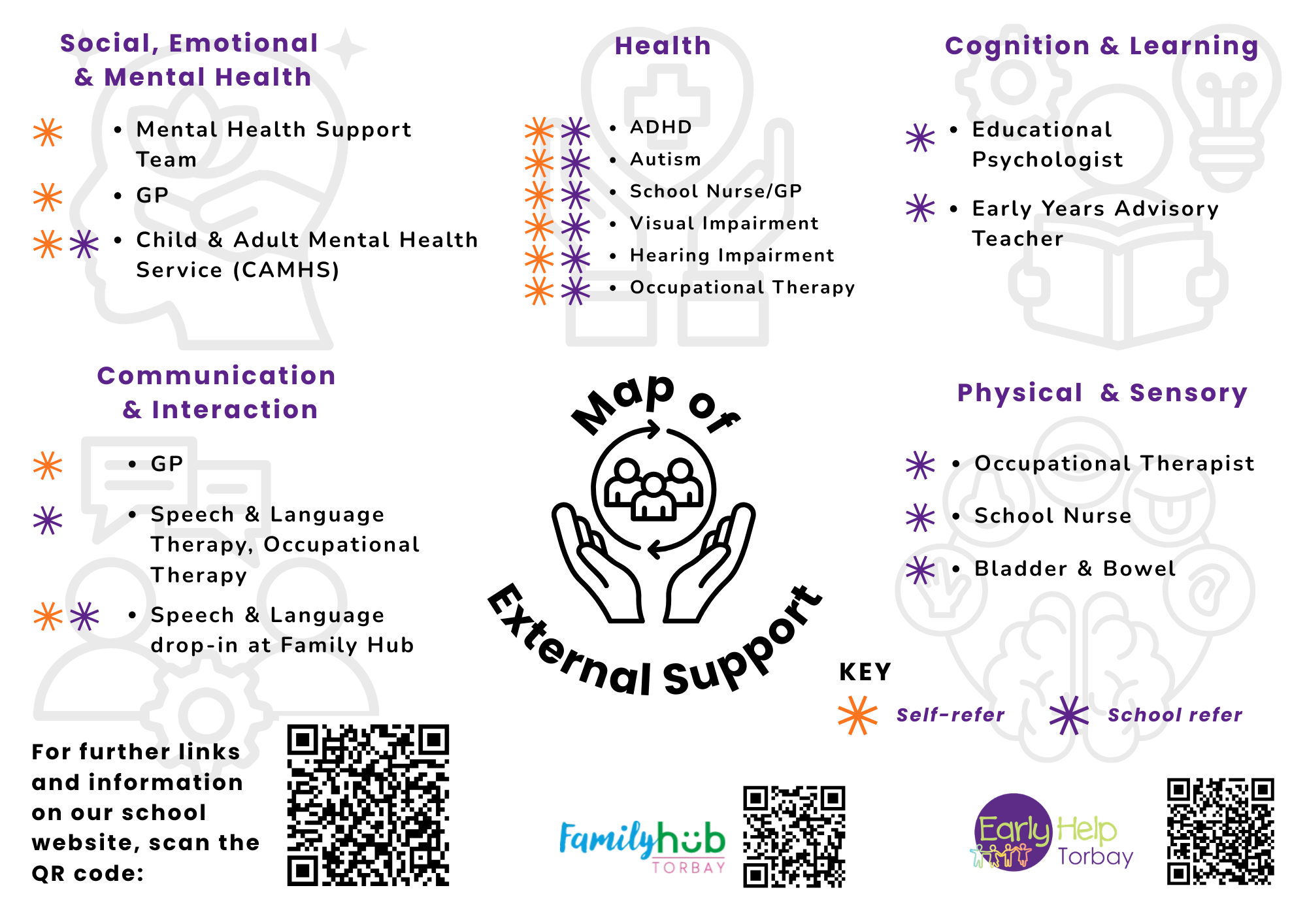 You can download this information as a flyer at the end of this page. Below is a map of external sources of support. Please also see the link to our Community Resources page.