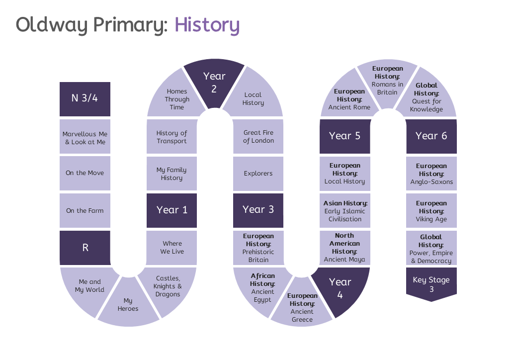 At Oldway, history is designed and taught in a coherent chronological narrative to help develop children's substantive knowledge of the history of Britain and the wider world. The curriculum is designed around three vertical concepts: